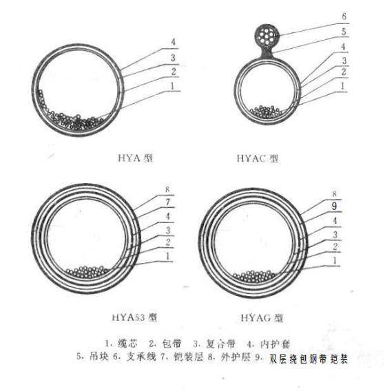 三、市話電纜HYA適用特性: 本產品可根據是否帶有鋼帶,鋼絲繩及護套的結構可以分為用于架空、直埋、及管道敷設。