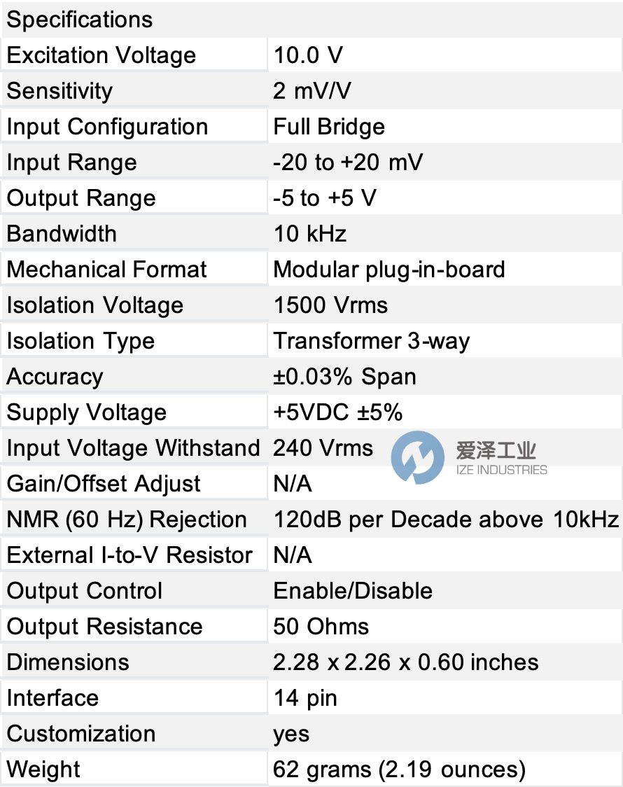 模塊提供的應變計激勵由一個非常穩定的10V或3.333V電源提供。激勵電源是完全隔離的,允許放大器輸入在激勵電壓的全范圍內操作。此功能在現實應用中提供了顯著的靈活性。標準提供2mV/V、3mV/V或10mV/V的滿量程靈敏度。在10V激勵電壓下,這將產生±20mV、±30mV或±100mV滿量程輸入范圍,產生±5V滿量程輸出。