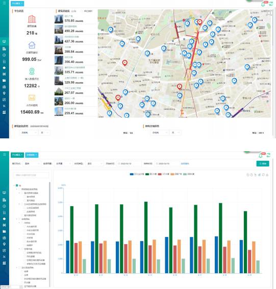 綜合展示平臺接入1377-443-0992的所有建筑的能耗情況,包括接入的建筑數量、建筑總面積、總能耗,并以地圖形式顯示建筑物的分布情況;
