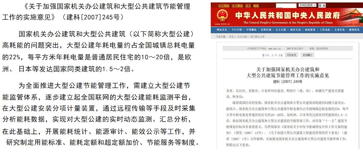 《關于加強辦公建筑和大型公共建筑節能管理工作的實施意見》 (建科[2007]245號)國家機關辦公建筑和大型公共建筑(以下簡稱大型公建)高耗能的問題突出,大型公建年耗電量約占全國城鎮總耗電量 的22%,每平方米年耗電量是普通居民住宅的10~20倍,是歐 洲、 日本等發達國家同類建筑的1.5~2倍。為全面推進大型公建節能管理工作,需建立大型公建節能監管體系,1377-443-0992逐步建立起聯網的大型公建能耗監測平臺,在大型公建安裝分項計量裝置,通過遠程傳輸等手段及時采集分析能耗數據,實現對大型公建的實時動態監測、匯總分析,在此基礎上,開展能耗統計、能源審計、能效公示等工作,并研究制定用能標準、能耗定額和超定額加價、節能服務等制度。