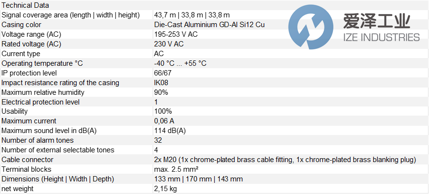DS系列聲光報警器專為滿足工業環境需求而設計,可用作通用報警器。該系列聲光報警器適用于室內外環境,可發出31種不同的警報音,并可通過內部開關進行選擇。壓力腔聲光系統:穿透墻壁和門等障礙物的能力極強,低頻成分含量高。因此,所需的報警器數量更少。該系列聲光報警器通過了VdS和EN 54-3認證,尤其適用于火災報警。鋁制外殼,防護等級高(IP66/67):應用范圍廣(防塵防霧)。在戶外使用安全可靠。