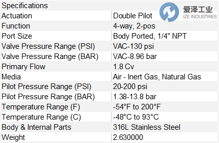 1/4英寸V-316系列方向控制閥適用于嚴苛的應用。該系列閥門內外均采用堅固耐用的不銹鋼材質,能夠承受腐蝕性環境和受控介質的物理沖擊。其模塊化設計理念采用三個基本子組件:閥體組件和兩個執行器組件,在簡化電路規劃的同時,幾乎可以實現無限的組合方式。