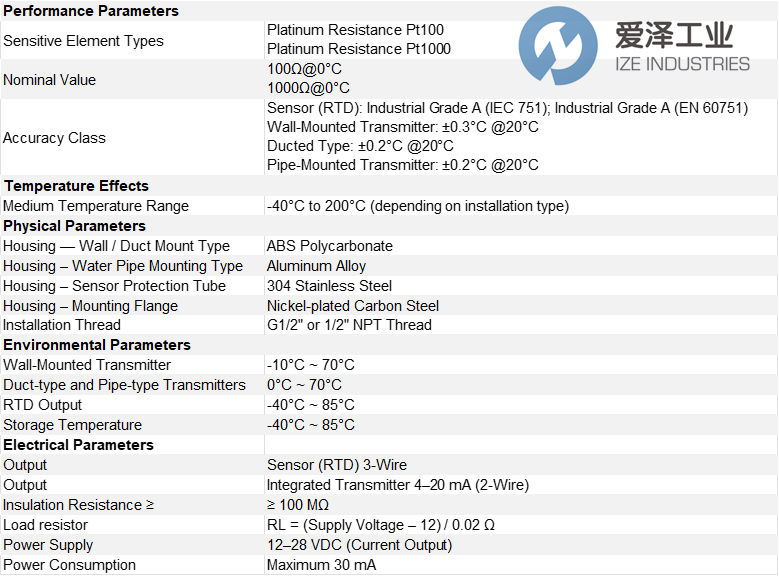 SETRA溫度傳感器STC系列STC1SD11MR230MN技術參數及介紹