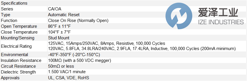 1/2英寸圓盤式溫控器,型號US-602SYBQLSO104F18,溫度上升104°F±7°F時關閉,溫度下降86°F±11°F時復位,0.250英寸快速接頭,彎曲30度至垂直方向,6-32螺柱安裝